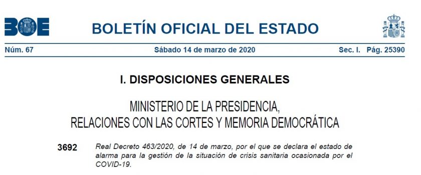 Real Decreto que regula las medidas establecidas en el estado de alarma decretado este sábado en España como consecuencia de la crisis generada por el virus Covid-19.
