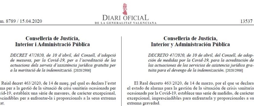 Os damos traslado del DECRETO 47/2020, de 10 de abril, del Consell, de adopción de medidas por la Covid-19, para la acreditación de las actuaciones de los servicios de asistencia jurídica gratuita para el devengo de la indemnización y su corrección.