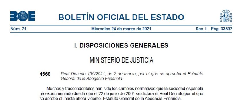 El Boletín Oficial del Estado ha publicado hoy, 24 de marzo, el Real Decreto 135/2021, de 2 de marzo, por el que se aprueba el Estatuto General de la Abogacía Española, que entrará en vigor el próximo 1 de julio de 2021.