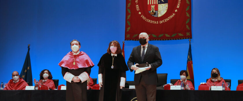 La Facultad de Derecho de la Universidad de Alicante (UA) ha entregado este pasado viernes una distinción al Ilustre Colegio de la Abogacía de Alicante (ICALI) por su colaboración en el Programa de Prácticas Externas que realizan los estudiantes de cuarto curso del Grado de Derecho y de Derecho y Administración de Empresas (DADE) y del Máster de la Abogacía. El decano del ICALI, Fernando Candela Martínez, ha recibido este reconocimiento de manos de la rectora de la UA, Amparo Navarro Faure, y del decano de la Facultad de Derecho, Jaume Ferrer Lloret, durante el Acto de Graduación de San Raimundo de Peñafort en el Paraninfo universitario. «Para el ICALI es una gran satisfacción colaborar activamente con la Facultad de Derecho y para nuestros despachos supone un privilegio tener acceso al talento joven de nuestra provincia», ha señalado el máximo responsable de la institución colegial.